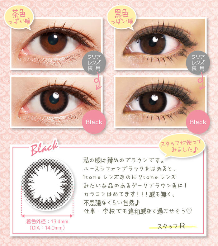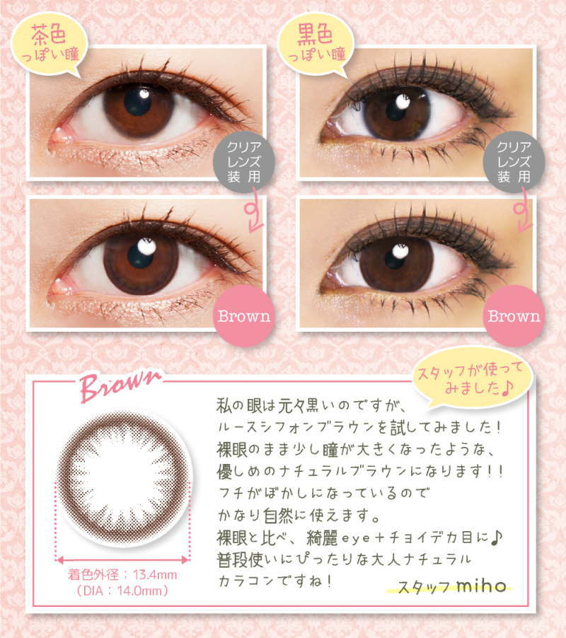 【6/15ポイント5倍 楽天カード決済&エントリー】4箱セット 度なし度ありカラコン 2ウィーク ブラウン / ブラック / キャメルブラウン / オリーブブラウン /キュートビュー14 ルースシフォン ゼル 2週間 1箱6枚入 コンタクトレンズ